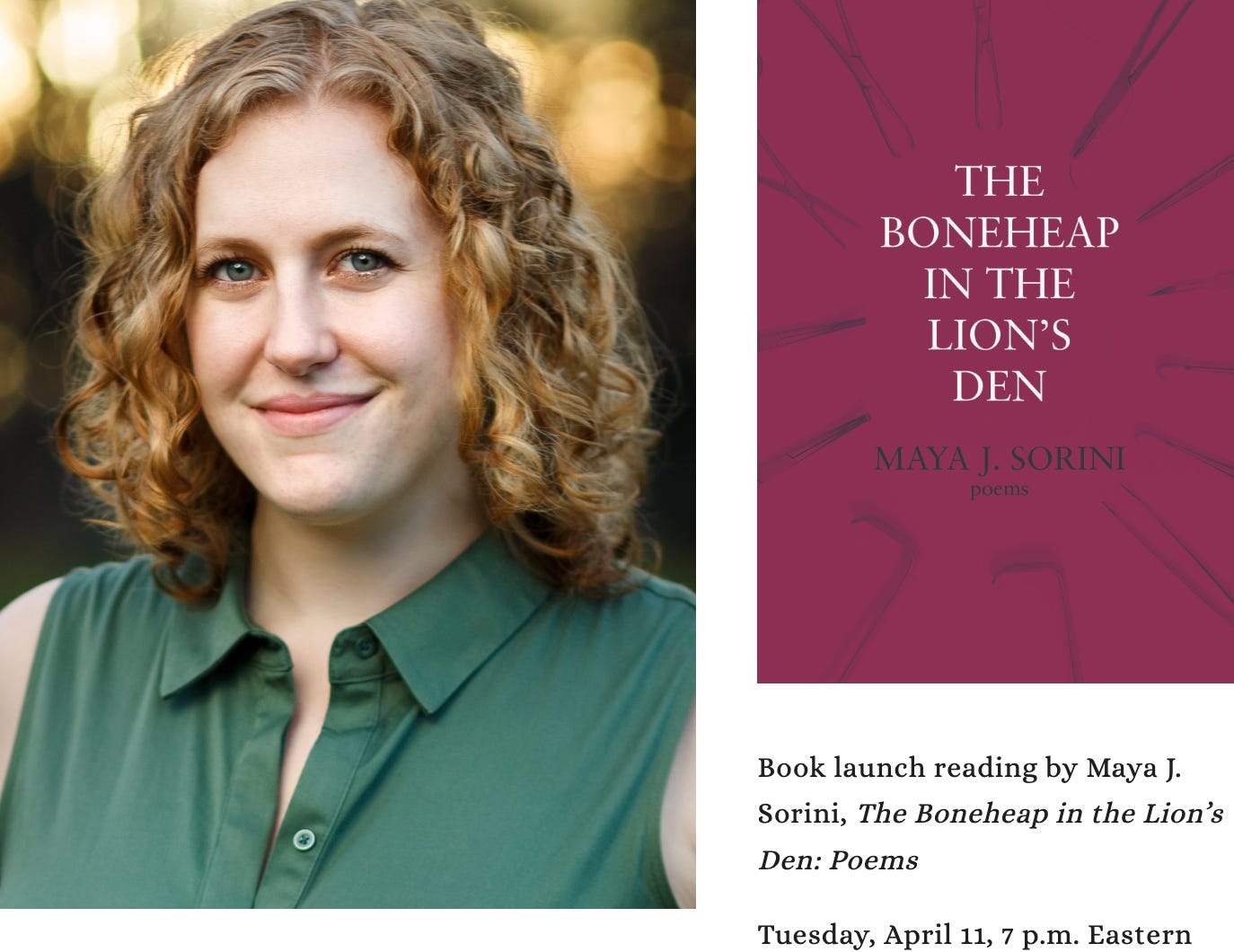 Maya J. Sorini is the author of the poetry collection, The Boneheap In the Lion’s Den (Press 53, 2023). Come to her book talk on 4/11 at 7PM EST (see below for details)